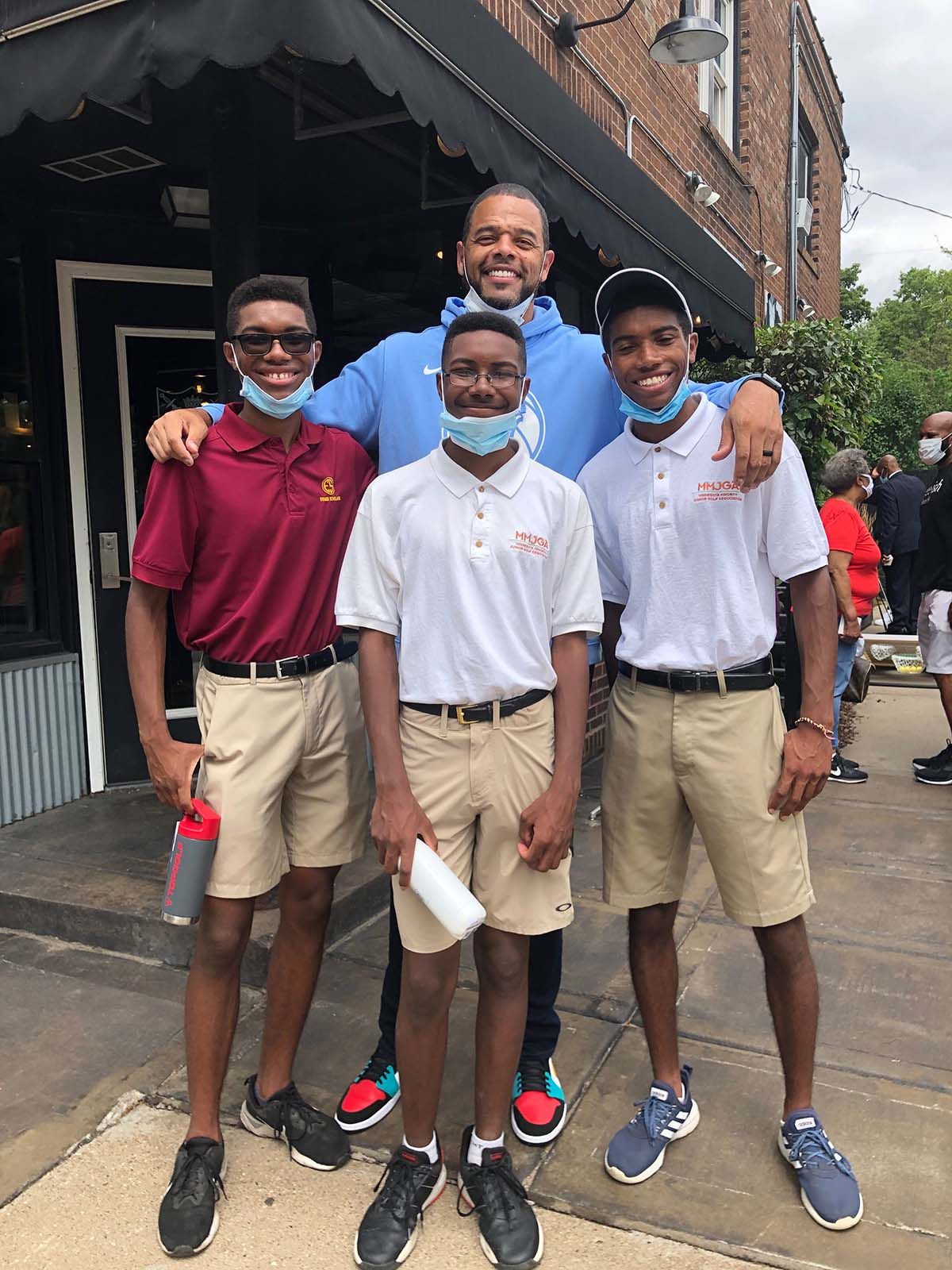 ForeUs participants (from left to right) Brandon (Evans Scholar Alumni), Bryson (Current Evans Scholar) and Ryan (Evans Scholar Alumni) at a community event with John Thomas of the Minnesota Timberwolves.